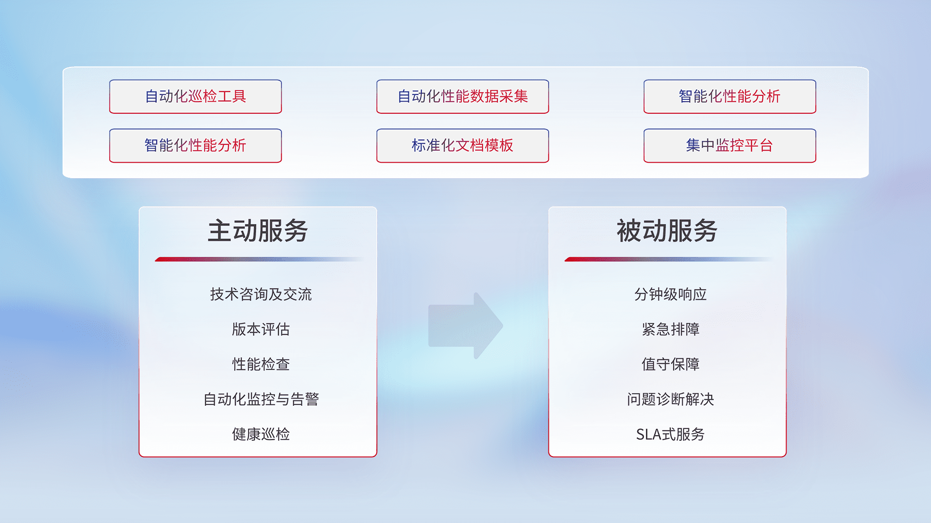 智能化工具和标准化文档,,保障服务质量,,,,提供主动服务(包含技术咨询、、、、版本评估、、、性能检查、、、自动化监控与告警、、、、健康巡检)和被动服务包含(分钟级响应、、、、紧急排障、、值守保障、、、、问题诊断解决、、、、SLA服务)。。。。